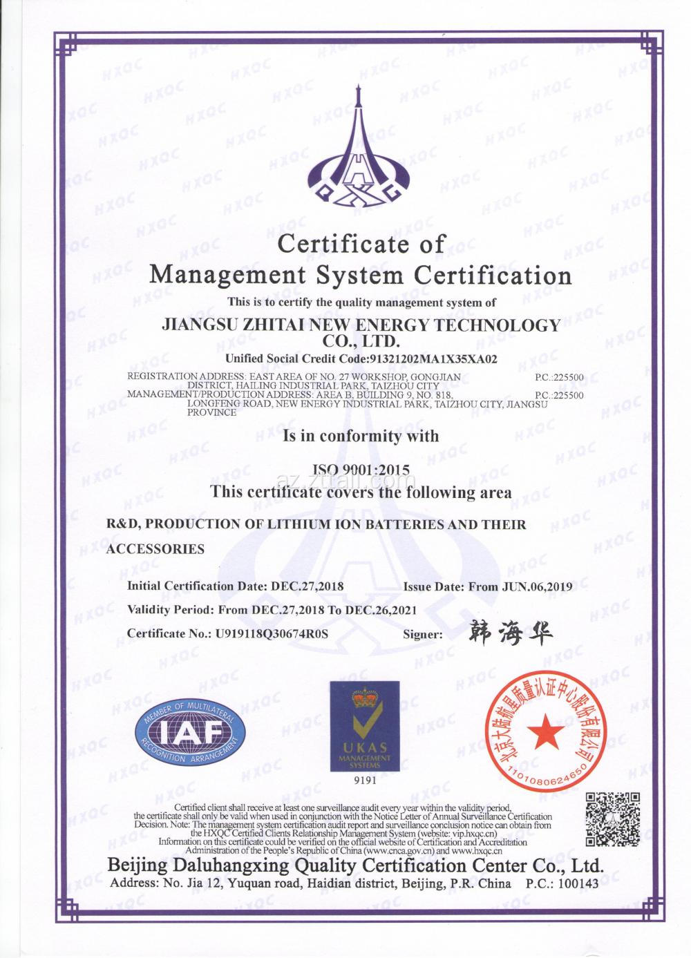 Jiangsu Zhitai New Energy Technology Co, Ltd, 2018-ci ilin avqustunda qeydiyyata alındı ​​və quruldu və Taizhuz əyalətinin Taizhou City, Taizhou City Hailing Industrial Park-da yerləşir. Bu, Tədqiqat və İnkişaf, İstehsalat, İstehsalat, Lityum-İon batareyalarının xidməti ilə məşğul olan yüksək texnoloji bir müəssisədir. Bu Taizhou City Hökumətinin əsas planlaşdırma müəssisəsi və Taizhou Yeni Enerji Sənaye Bazası'nın bir meyar müəssisəsidir. 2018-ci ildə qurulduğu gündən bəri Zhitai, 5G baza stansiyasının ehtiyat sisteminin bazar boşluğuna yönəldilmişdir. Çox sayda yüksək texnologiyalı istedad toplayaraq, getdikcə inkişaf edən 5G baza stansiyasının ehtiyat sisteminin ehtiyaclarını ödəmək üçün litium batareya paketlərinin yeni məhsulları tez bir zamanda hazırlanmışdır. Texnoloji nailiyyətlərin irəliləməsinə və məktəb və müəssisələrin əməkdaşlıq yeniliyi, Taizhou-nun yeni enerji sənayesində xarakterik bir müəssisə meydana gəlmişdir.